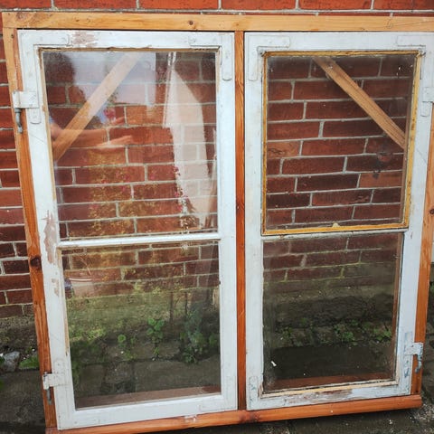 Der er tre stk dobbelt lags vinduer. 2 store og et mellem stort som er lidt smallere med oplukkeligt ovenvindue. Mål 160cm x 116cm, 160 x 95,3cm, 160x 53,3cm.