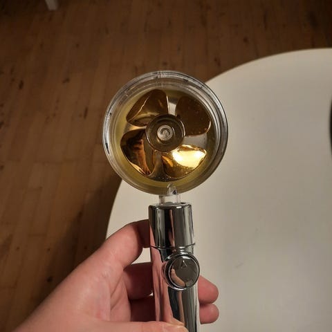 Smart brusehoved der lyser når man tænder for vandet og slukker igen lidt efter at man har slukket for vandet