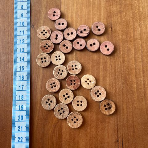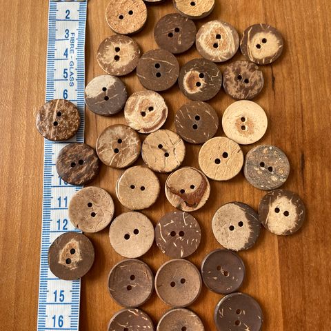 Knapper af kokosnøddeskal med glaseret front i fem forskellige farver: fersken, grå, turkis, rød, hvid, mørkblå, gul og bordeaux