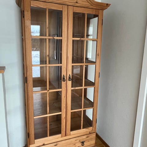Flot vitrineskab i massiv bøgetræ sælges. Meget flot stand. Der medfølger indvendig lys og div. ledninger. Bemærk at den er fra Klim Møbelfabrik.