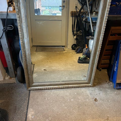 Stor rektangulært spejl med træramme. Jeg tror, at det er egetræ.