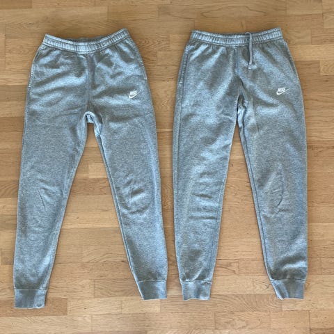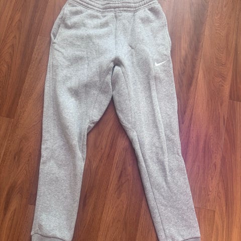 Nike joggingbukser i størrelse L. Farven er grå, og de er velegnede til afslappet brug eller træning. Bukserne har en elastisk talje med snor og elastik ved anklerne samt 2 lynlåslommer, og er lavet af et komfortabelt materiale, der giver god bevægelsesfrihed.