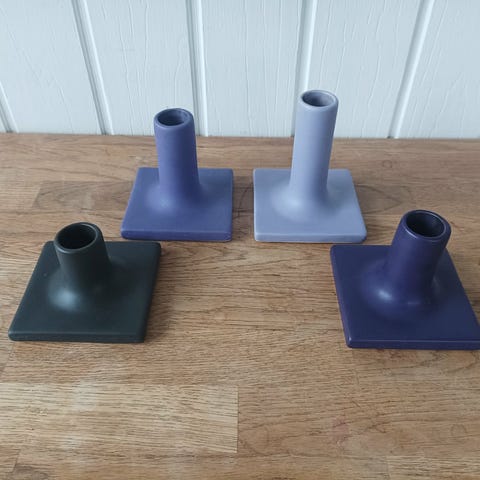 3 lysestager, Modern Living, Af ukendt træsort. 2 stk. er grønne forneden. Den lave blå forneden. Kr 50,- for alle tre (d).