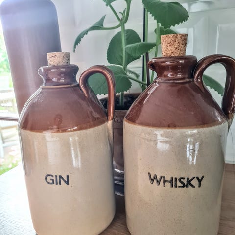 Porcelæn, 2 ældre kander i porcelæn., Gin, whisky- reklame- kander., 2 super dekorative spiritus-mix - kander. Fremstillet I 1950erne.