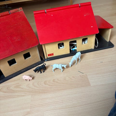 Smuk vintage træ bondegård fra Reisler med den karakteristiske strukturmaling på tagene. Modellen er fra 1960´erne og har aftagelige tage. Der medfølger 44 dele. Drømmer du om at blive gårdejer er her chancen :-) Mål på bundplade: (30 x 30)cm.