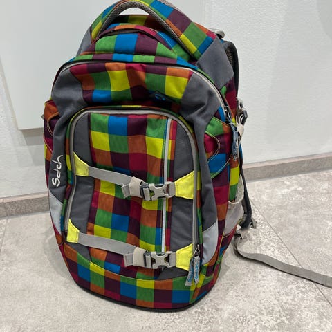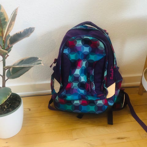 Lyserød skoletaske der kan justeres efter barnets højde. Med bredt hoftebælte. Tasken kan stå selv.