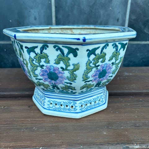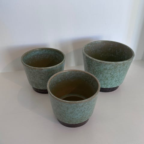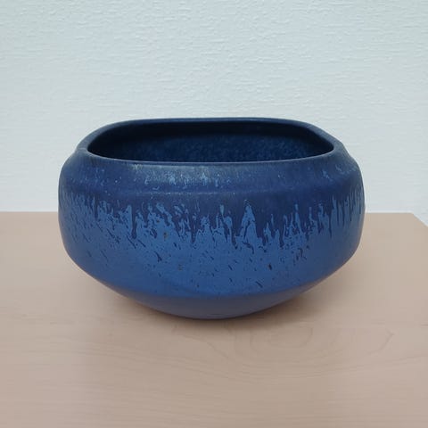 Fin lille vintage potteskjuler fra Knabstrup i flot blå glasur og indvendigt brun. Virkelig dekorativ og enkel. Har lille skår indvendig af potte samt på kant af bund- ses dog ikke udefra.