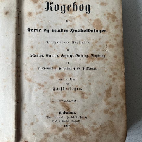 Madam Mangor´s kogebog. Omslag med et par smårifter. Bogen pæn og helt ren. Samlet udgave af: Kogebog for smaa Huusholdninger, og: Fortsættelse af Kogebog for smaa Huusholdninger, og: Syltebog for smaa Huusholdninger, Originaludgaver: 1837, 1842, og: 1840.