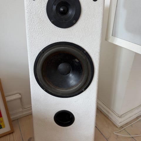 Denne model er en gulvhøjtaler, i mahogni (mørk rødbrun)