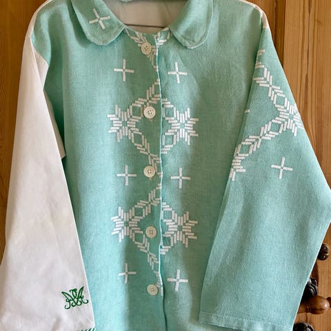 Smuk blå jakke med broderier og lommer syet af broderede duge i eget design, Design by Jane, str M-XL sælges kr 950,- #broderededuge#jakkemedbroderi#egetdesign#designbyjane#genbrug#recycling#homemade#håndsyet#smukjakke# fragten aftales individuelt!