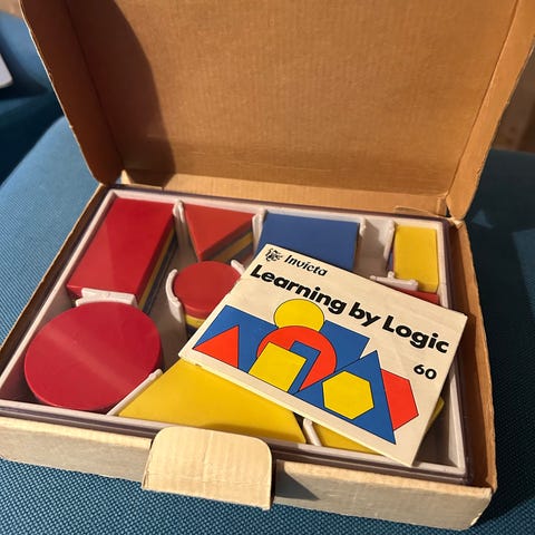 Lærings tavle med alle brikker. Kassen ser mere slidt ud end spillet er.