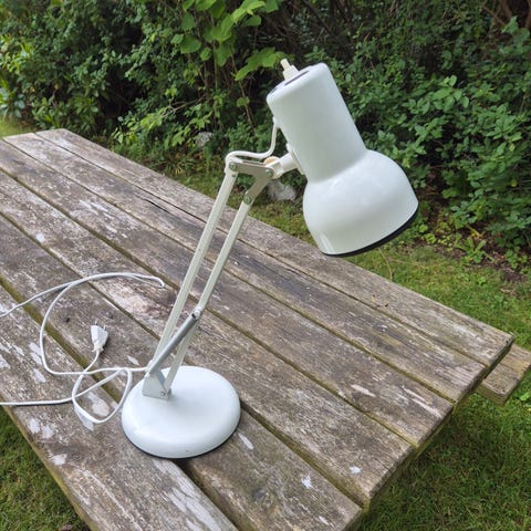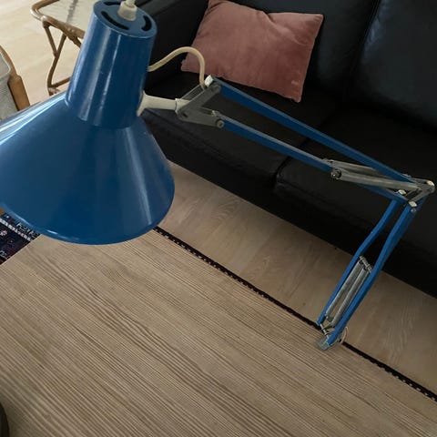 Lampen er i god retrostand med almindelige aldersrelaterede brugsspor, herunder lettere overfladeridser i skærmen. Fjedrene kan holde armen i alle positioner, og den originale matchende bordklemme giver lampen et solidt fodfæste.