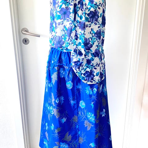 Kjolesæt - overkjole + underkjole stropløs, str. S, Kjole i blå thaiagtig silke. Lynlås i ryggen. Stropløs. Ovenpå er en kåbe agtig kjole der knappes med snore foran. Kjole og kåbe sælges samlet. Str. S/M. Sender gerne på købers regning via DAO, Bring eller GLS.