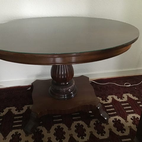 Ældre rundt mahogni bord. Har stået i et sommerhus de sidste mange år.