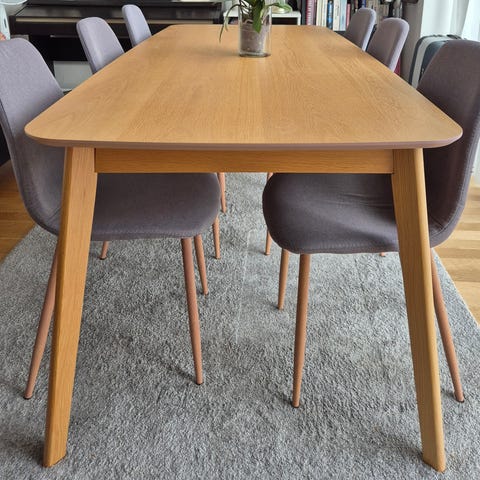 Flot og robust spisebord fra sit’ n’ sleep, kun 2 år gammelt med lidt brugs spor på pladen. Praktisk med lyst træstel i midten af bordet, så stolene bedre kan være der. Der kan sidde 4 pers på hver side (afhængigt af stolestørrelsen)