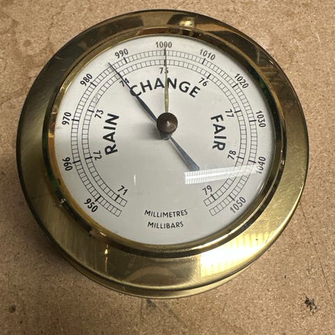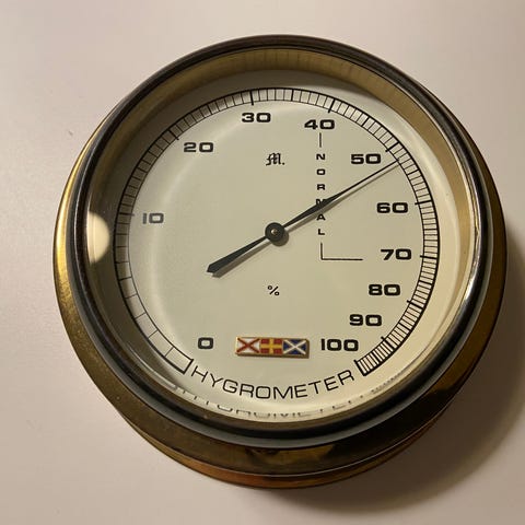 Fint lille hygrometer i messinghus af mærket Devina. Dansk produceret. Ø100mm i fronten, Ø120mm bag på. Helt nyt og ubrugt. Original embalage.