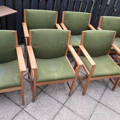 Sælger et sæt på 5 originale Børge Mogensen-stole model 3258, produceret af Fredericia Stolefabrik. Designet i 1950’erne/60’erne – en dansk designklassiker med det originale mærkat under hvert sæde (se billede).