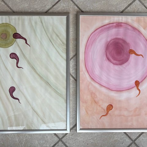 To helt unikke og retro udstillingsrammer med kunstnerisk veludførte 3D-portrætteringer af barnets udviklingsstadier i kvindens livmoder. Sælges samlet for 3.900 kr.