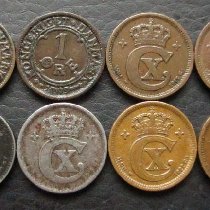 En masse gamle 1-ører fra forskellige årstal. Ialt 3647 stk. Vægt ialt: 5729 gr.