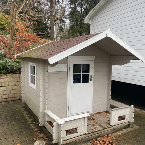 Specialbygget legehus i massiv lærk, brugt men i fin stand. Kan skilles ad (hvis man er god m værktøj) og ellers flyttes m kran (meget tungt). 170 cm bredt og 200 cm langt (2 m til loft i kip).