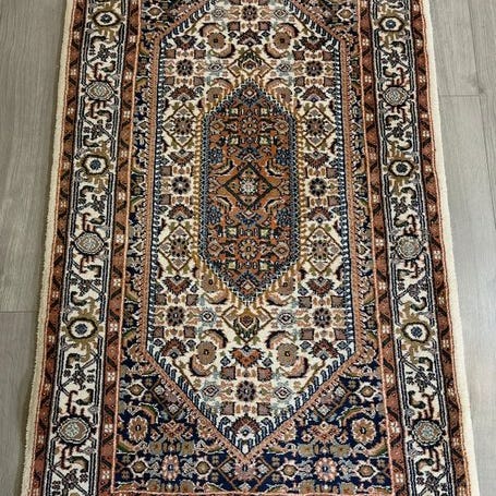 Persisk Bidjar tæppe i uld fremstillet omkring år 1900. Sjældent Bidjar design. Fremstår med manglende/slidte frynser og kanter, men er ellers i fin stand. Ingen røglugt eller lignende.