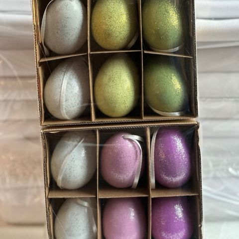 Seks påskeæg til dekoration. Der er forskellige motiver på. Æsken er aldrig blevet åbnet, men der er et lille hul i plasten, dog helt uden betydning.