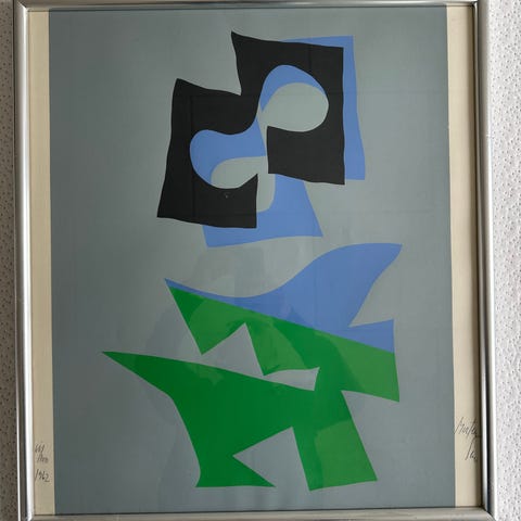 Konkretkomposition er et originalt litografi Signeret Richard Mortensen ”. mål med ramme 68 x 58 cm og rammemål 73 x 60 cm. Værket er med Passe partout og med en sølvfarvet aluminiumsramme.