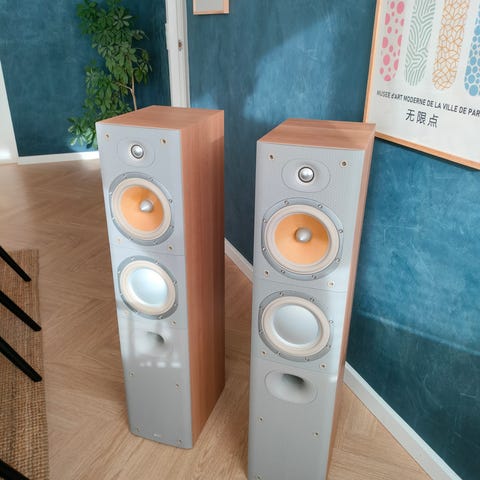 B&W DM 603 S2 gulvhøjttaler, sæt. God stand, velspillende, med enkelte mindre brugsspor på kabinetterne. Har altid stået med frontstof monteret. En af single-wire jumperpladerne mangler på den ene højttaler (den skal kun bruges, hvis højttaleren anvendes med single-wire højttalerkabel). Der medfølger et sæt Chord Rumour bi-wire højttalerkabel (2 á ca. 4 m). Skal afhentes. Sælges også i sæt med matchende B&W 600-serie center og baghøjttalere, se anden annonce.