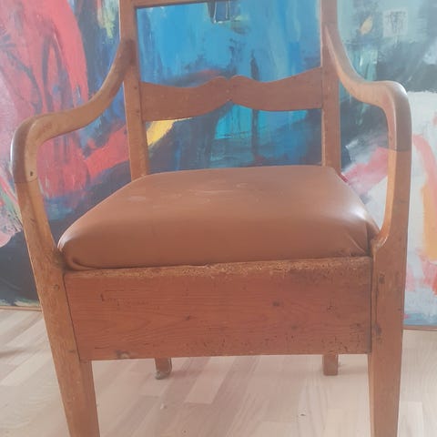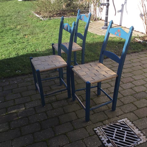 2 stk robuste gulmalede stole, siddehøjde 40 cm.