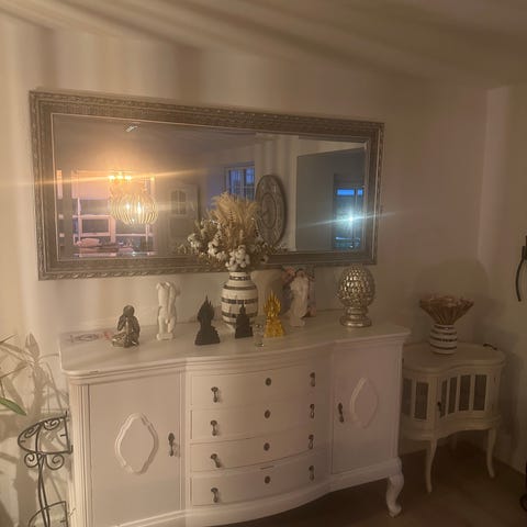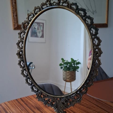 Er købt i en antikvitetsforretning i Sverige. Er 100 år gammel, og kanten er lavet af sølvplet. Spejlets yderkant er sandslebet i et flot mønster.