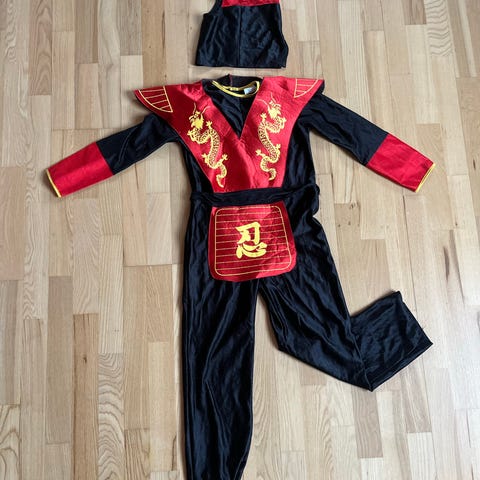 Ninja kostume, str. 140 bestående af buksedragt, bælte, vest og blød stof “maske”/hætte.