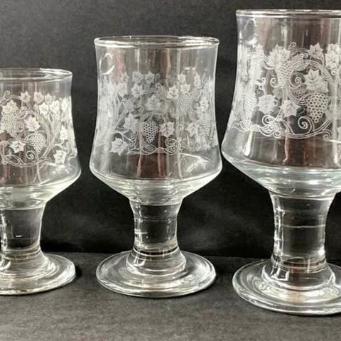 Glas, Blandede glas med slibning og sort fod 44 stk., Hebe slibning / Bacchus, Efter et godt og langt liv hos mine bedsteforældre og efterfølgende 21 års nedpakning, er disse smukke glas nu kommet frem i lyset og søger nye ejere.