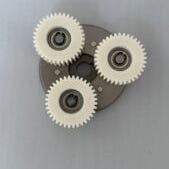 Tre hvide plastiktandhjul med kuglelejer i midten (planetgear)