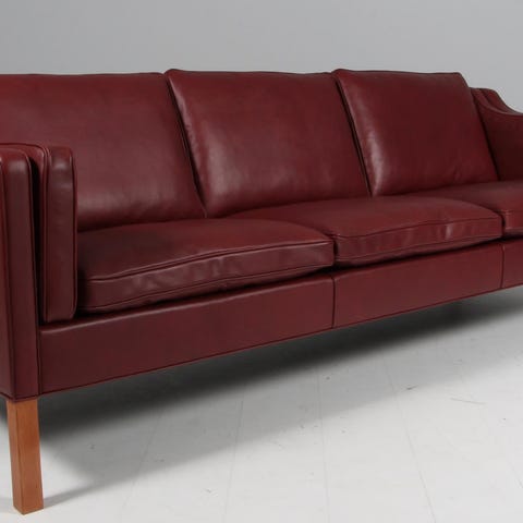Børge Mogensen 1914-1972. Fritstående tre-pers. sofa, betrukket med med mokka elegance anilin læder, løse polydun hynder i sider, sæde og ryg, ben af teaktræ. Fremstillet hos Fredericia Stolefabrik, model 2213. Formgivet 1963. H. 76/44. L. 220, D. 80 cm. Fremstår professionel nybetrukket med mokka elegance anilin læder. Nye polydunhynder.