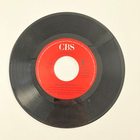 CBS Single vinylplade i størrelse 7 tommer, sort farve. Pladen har en rød label med CBS-logo og indeholder to sider med musikindhold.