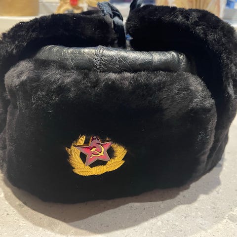 Russisk militær pelshue i mørkebrun farve. Denne unisex hue er lavet af blødt skind med et quiltet indre for ekstra komfort. Perfekt til kolde vejrforhold. Oprindelse Riga.