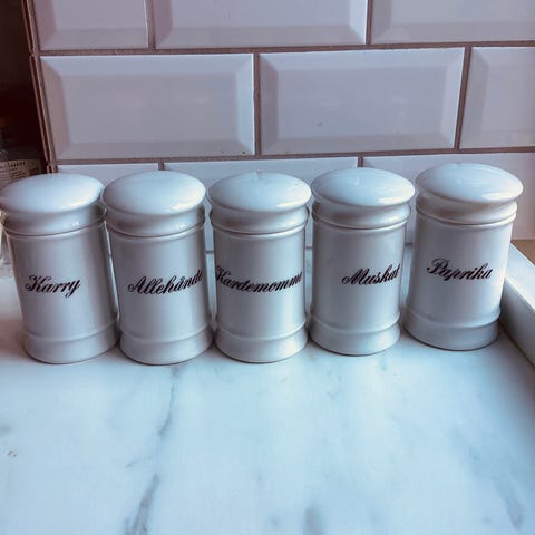 15 krydderikrukker, heraf de 13 med æske