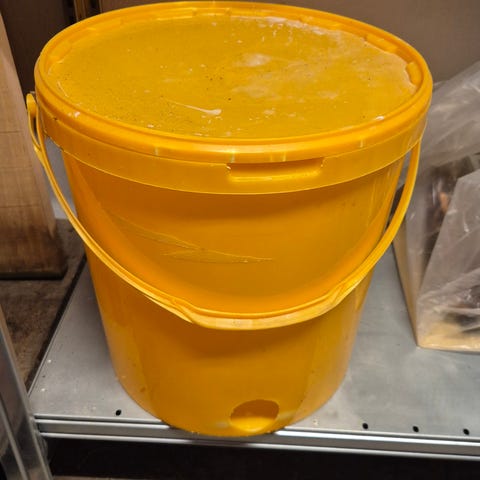 65kg tappespand med skruelåg. Har været brugt som rørespand til honning. Spanden er i meget god stand.