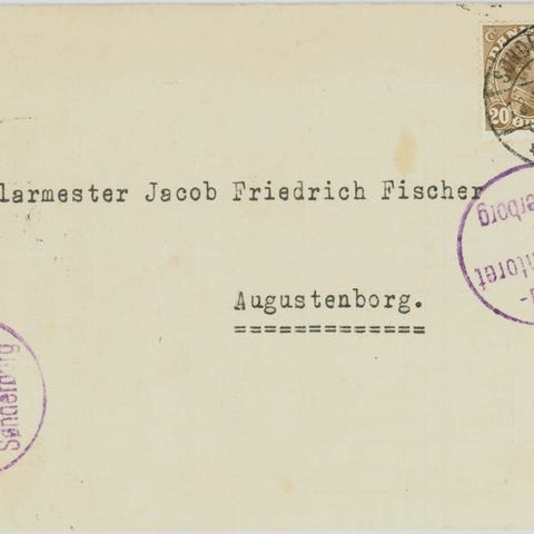 Forretningsbrev med fuldt indhold (regning) fra fa. Svend Petersen & Co., Rådhustorvet 5, Sønderborg. Stemplet med BLÅT forsøgsstempel Sønderborg 6.2.1922. Sendt til smedemester H. Carlsen, Majbøl pr. Hørup. Kuverten forrevet ved åbning af brevet.