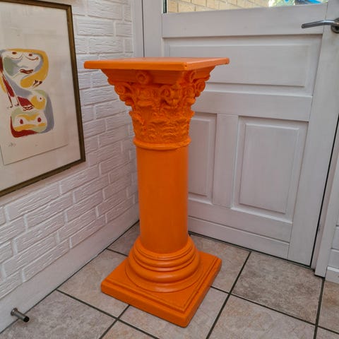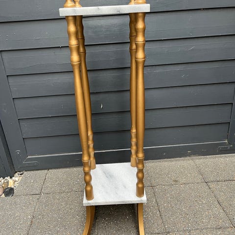 2 temmelig gamle (anslået fra 1920'erne) blomstersøjler 45 og 55 cm og en vægthængt blomsterhylde. Hylden har en lille skade ind mod væggen. Sælges samlet.