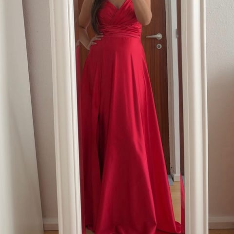 Str. Der står 42 på kjolen men den er blevet syet efter min str. 38. Materiale: 100% polyester.