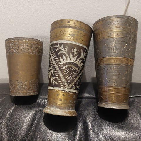 Dette lille bæger af bronze er så fint med patina og smukke kærlighedsmotiver. Blev brugt som bryllupsgave tilbage i 50'erne/60'erne.