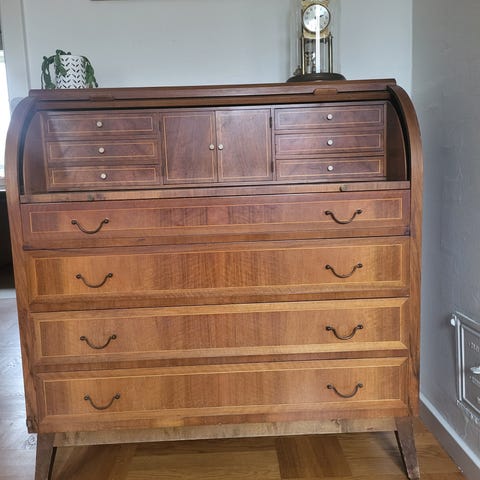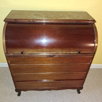 Smukt, gammelt chatol - i sin tid givet i bryllupsgave i 1858. Har tilhørt ejeren af Nobel Tobak, som jeg er i familie med (se billede). Mahognifarvet, men ved ikke, hvilken træsort det er.