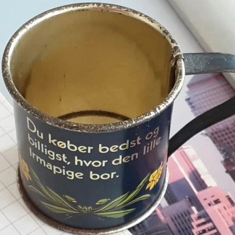 Irma kaffemål i metal med Irma pigen. Højde og diameter 4cm. Lette brugsspor.
