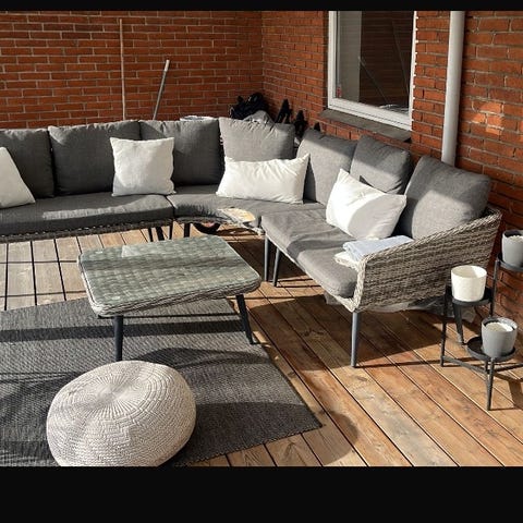Hynderne er vasket. Det kunne de ikke tåle, en masse løse tråd indvendigt og noget af stoffet gået op. Derfor kan de følge med gratis, ellers er det 5 stks møbler med et bord.