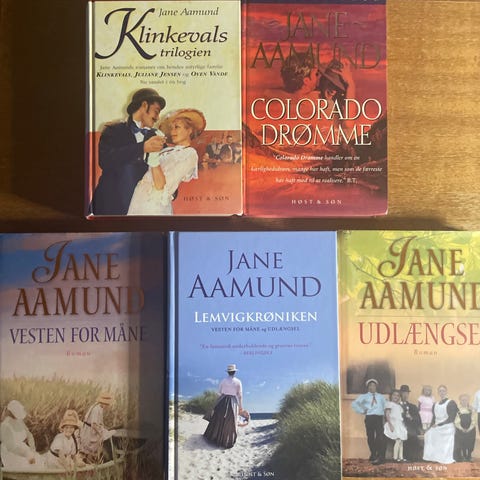 ., Jane Aamund, genre: roman, Klinkevals Trilogien - Naboens Søn - Juliane Jensen - Smeltediglen - Den Grønne Port - Colorado Drømme - Bjergsted Drømme (er solgt)