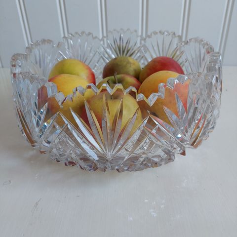 Krystalskålen er af tungt presset glas og måler 15 cm i diameter og er 6,5 cm høj.