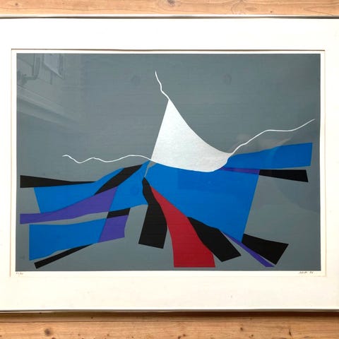 Flot sjældent udbudt litografi af Aarhus kunstneren Jørn Rønnau. Kendt for sine store træskupturer i Aarhus, særligt i Marselisborgskovene. Grafiske og typografiske elementer i 80'er farver. Blå, lyseblå, orange, sølv.