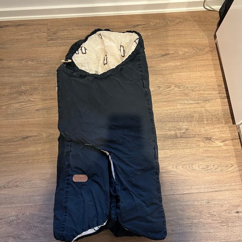 Nogle af snorene er skiftet, da de var slidte og der er lidt afblegning på stoffet (se billede 3 og 4). Det var ingen betydning for anvendelsen, og den kan fortsat holde babyen dejlig varm.