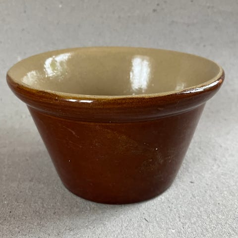 Højden på skålen er ca 7 cm. diameteren i bunden er ca 6,5 cm, diameteren foroven er ca. 9,5 cm. Skålen fremstår med få brugsspor, men uden fejl og mangler.